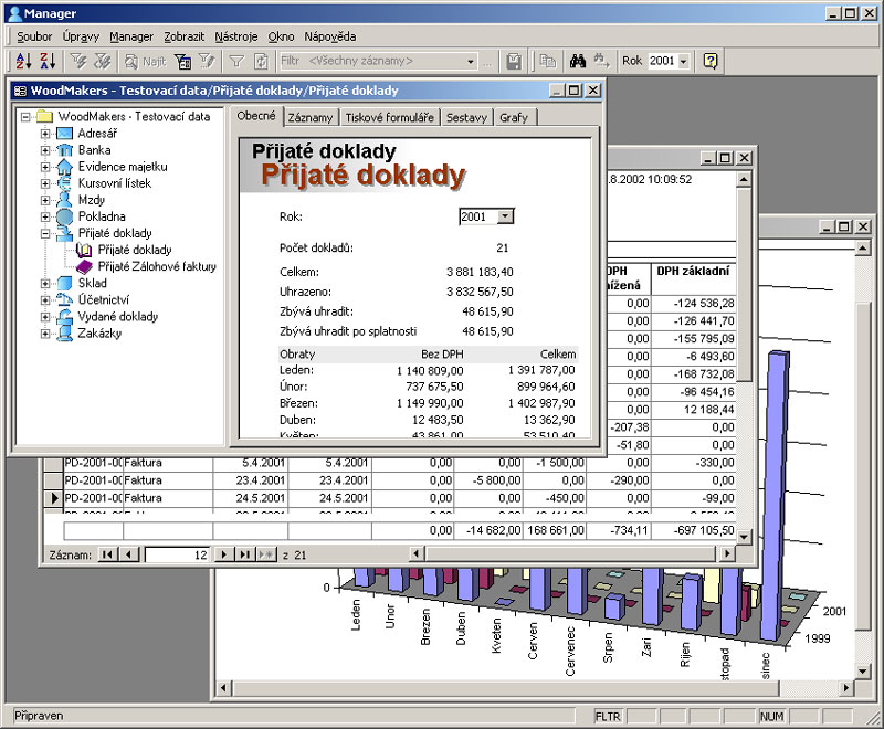 Uživatelské prostředí – úpravy, doplnění funkcí Jak jsme již předeslali v úvodu, mezi základní vlastnosti Varia (nejen nové verze) patří flexibilita a maximální integrace s prostředím Microsoft Office 2000/XP včetně uživatelského rozhraní, takže pro uživatele produktů Office je ovládání Varia zcela intuitivní. Flexibilita programu je dána možností uživatelského nastavení téměř všech vlastností programu, číselníků a sestav. Ekonomické moduly umožňují vedení neomezeného počtu knih dokladů s možností definovat libovolné číselné řady. Skladové hospodářství umožňuje vedení neomezeného počtu skladů. Stejně tak počet účetních subjektů není prakticky omezen. Všechny moduly umožňují návrh vlastních sestav s rozsáhlými možnostmi výpočtů a formátování analyzovaných dat. Systém lze ale nejen modifikovat, ale také doplňovat. Vario je aplikace databázového prostředí Access 2000, a proto jej lze dále doplňovat pomocí prostředků MS Office a přizpůsobovat požadavkům uživatelů. Je možno například upravovat stávající tiskové formuláře nebo vytvářet nové v Accessu. Data je možno prezentovat nebo analyzovat v programech Access, Excel a Word. Malou ukázkou těchto možností je vestavěná funkce pro automatické generování dopisu v programu Word z jakéhokoli dokumentu Varia, který obsahuje adresu, nebo hromadná korespondence modulu Adresář. Poněkud náročnější požadavky uživatelů lze plnit pomocí technologie doplňků (Access Add-ins), které lze doinstalovat do Varia. Lze je potom spouštět z menu doplňků v libovolném modulu. Mohou řešit libovolné úkoly s daty systému, například hromadnou fakturaci třeba v návaznosti na data z externích zařízení.