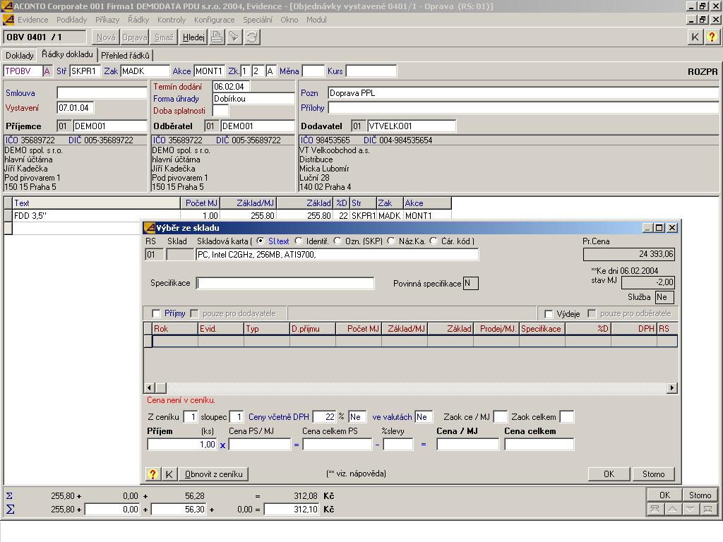 Obr. 1: Detail objednávky došlé s oknem pro nahlížení do skladu