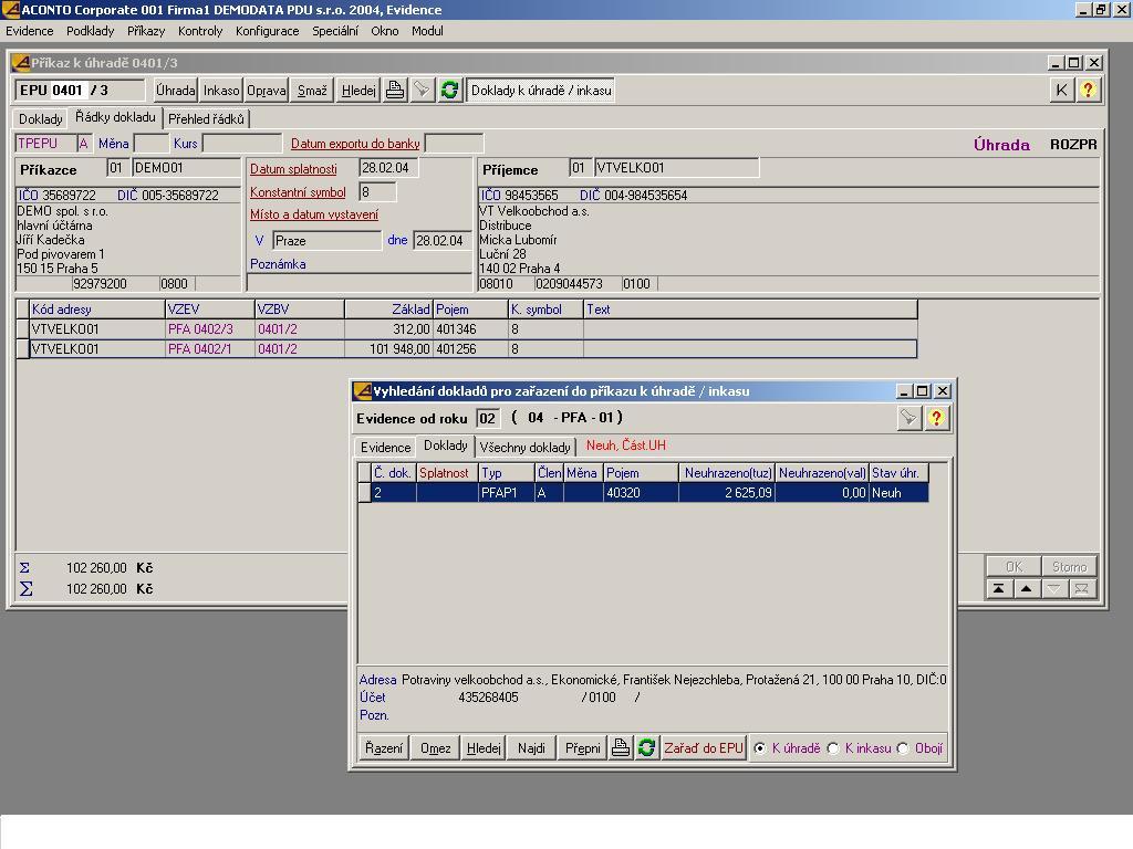 Obr. 2: Řádky příkazu k úhradě, který je vytvářen ve vazbě na evidenci faktur a závazků. V jednotlivých řádcích je vidět vazba na evidenci PFA (VZEV) a bankovní výpisy (VZBV).