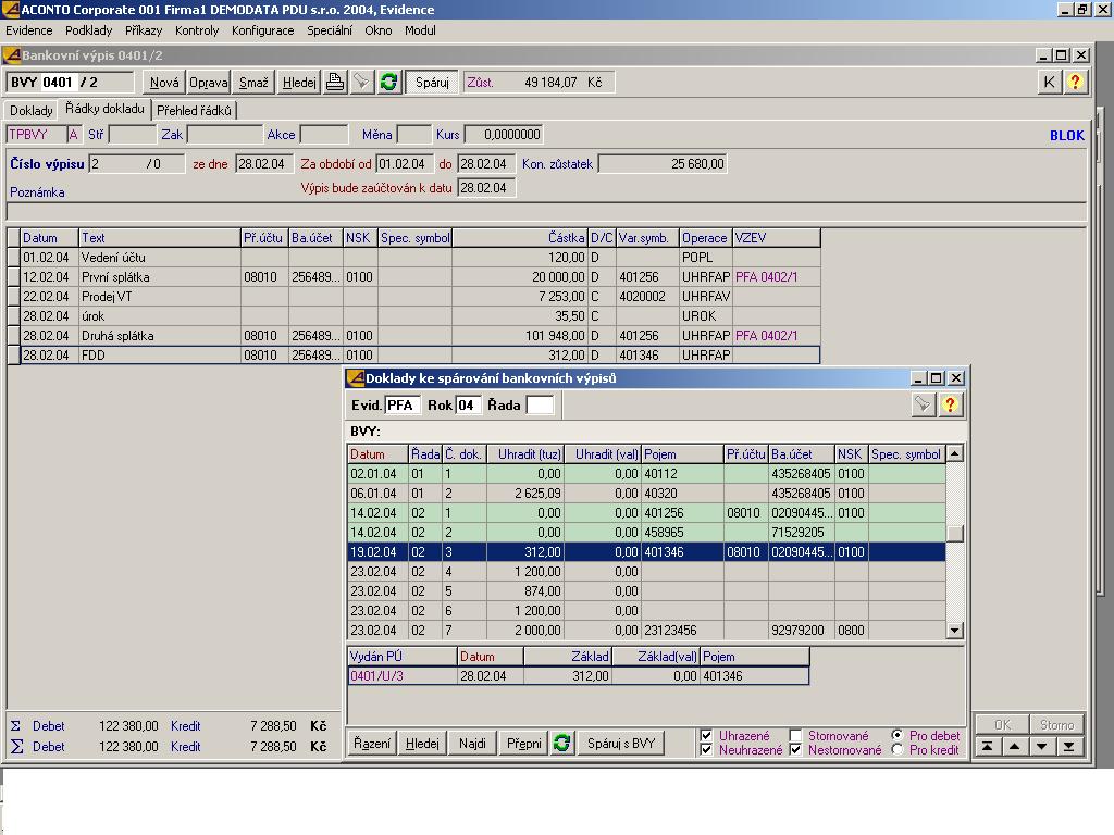 Modul evidence představuje dle mého názoru nejsilnější část systému. Umožňuje zaevidování pohledávek nebo závazků, včetně leasingových, a jejich párování s výpisem či pokladnou, přičemž párování může proběhnout dle zadaných parametrů (např. variabilního symbolu), či přímým výběrem pohledávky nebo závazku. Na závazky individuálně či hromadně vystavit příkaz k úhradě, komunikace s bankou může probíhat i elektronicky.Problémy programu nedělají ani složitější operace jako zápočty pohledávek a závazků či kurzové rozdíly u cizoměnových operací. Přímo z programu lze vygenerovat rovněž daňové přiznání k DPH, přednastavené číselníky byly korektně připraveny pro přenos všech obvyklých operací při nákupech i prodejích do správných řádků daňového přiznání.