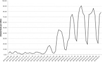 Obr. 1: Graf ukazuje počet zařízení infikovaných exploit kitem DNSChanger na jeden milion zařízení.