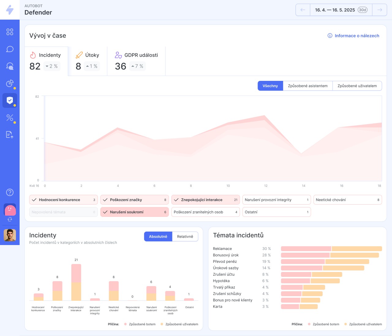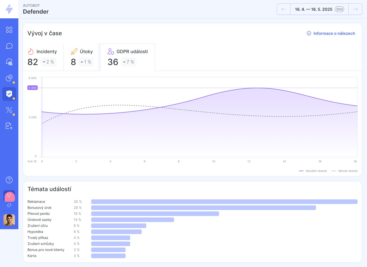 a dodržování GDPR detekcí úniků citlivých údajů. Díky specializovanému Privacy Risk Analyzeru nástroj rozpoznává citlivé údaje podle GDPR i v případě, že je uživatel zadá do konverzace, což je pro firmy zásadní pro připravenost na audity a regulátory.